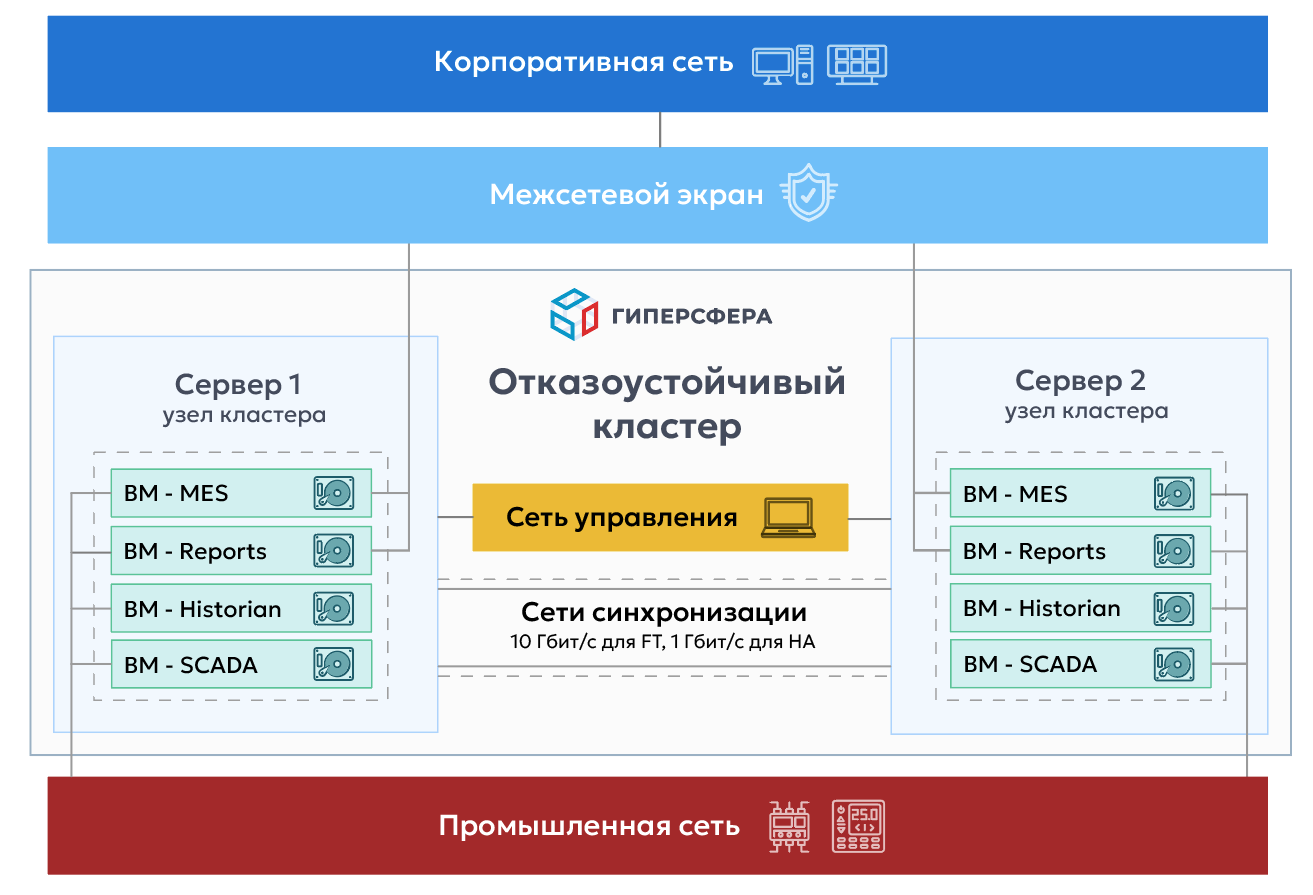 На производственном предприятии, где АСУ ТП включает сервер управления технологическими линиями, сервер управления производством, архив данных и вспомогательные сервера, “ГиперСфера” позволяет разместить все эти сервисы в одном отказоустойчивом кластере. В случае выхода из строя одного сервера все виртуальные машины продолжают работу на втором узле без перезагрузок и простоев, что исключает остановку технологического процесса.